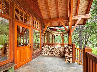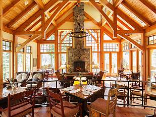 Das imposante Holzgebäude mit seinen großen Fensterfronten, vermittelt das Gefühl direkt in der Natur zu sitzen. Abends lädt das Restaurant und die Lounge zum gemütlichen Sitzen und Schlemmen ein, während das Feuer im Steinkamin lodert.