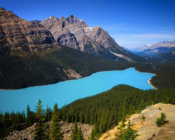 Heute fahren Sie den Icefields Parkway, die wohl schönste Paßstraße der Rockies. Peyto Lake, Mistaya Canyon, das Columbia Icefield und die Athabasca Falls sind nur einige der Höhepunkte dieser spektakulären Strecke. Drei Nächte im Chinook Cove Guesthouse. (285 km)