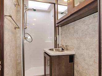 Kühlschrank, Gefrierfach, Herd, Mikrowelle, Spüle, Elektrische Wasserpumpe, Fließend Kaltwasser, Fließend Warmwasser, Heizung im Wohnbereich, Dusche, Waschbecken, Toilette, Frischwassertank: 115 L, Abwassertank: Greywater 98L, Blackwater 85L