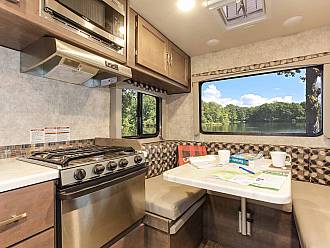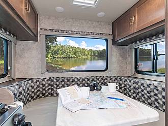 Bett im Alkoven (213 x 135 cm), Essecke (Dinette) umgebaut (183 x 122 cm)
